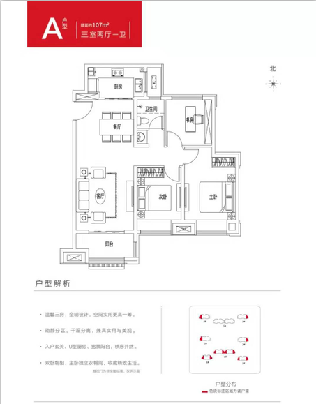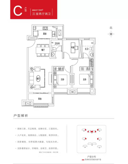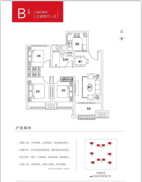 温馨三房,全明设计,实用空间更高一筹 动静分区,干湿分离,兼具实用与美观 入户玄关,U型厨房、宽景阳台,秩序井然 双卧朝阳,主卧独立衣帽间,收藏精致生活